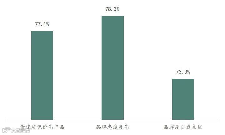 以新中产人群为例,77.1%的人群青睐“质优价高”的产品,价格敏感度较低,对“高品质产品应具备高溢价”具有极高认同度;78.3%的人群对品牌忠诚度高,并有77.3%的人认为品牌是自我的象征。