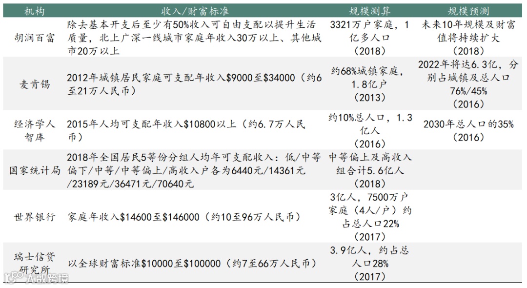 新中产阶层是新富人群的主力军,不同机构对中国新中产阶层的定义及统计时点差异较大,综合以家庭收入1.46万-14.6万美元的宽标准我国中产已超过22%;而以胡润百富复合标准“去除基本开支后50%以上可自由支配,且一线收入30万以上,其他城市20万以上”,所得优质中产约占人口的10%。