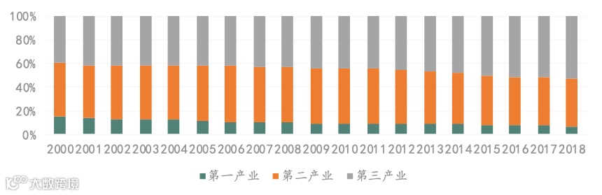 1952年,农业吸纳了83.5%的就业人口,到2018年降至26.1%,成为就业人数最少的产业。相对的,第三产业2018年产业比重达到52.2%,占据国民经济的半壁江山。