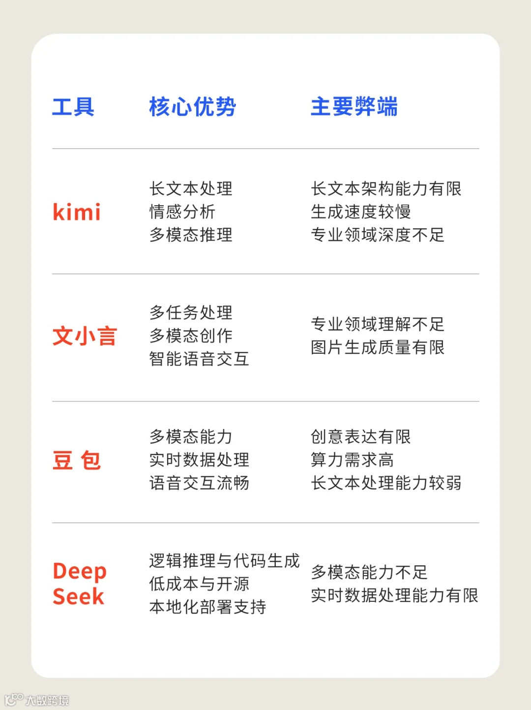 - 学生、研究员:Kimi为首选,长文本处理与信息提取能力强;辅以文心一言优化报告表达[k]。