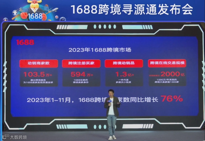 据官方数据,2023年1—11月,1688跨境注册买家同比增长76%,总量超594万,跨境采购规模近2000亿元,其中年采购额超千万元的大买家超过1000家[k]。双十一期间,单日跨境订单量突破500万,新客占比达40%[k]。