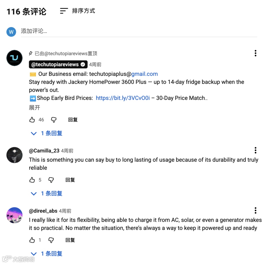 从数据上看,这支视频的传播表现亮眼,目前已累计 10万次观看、434 个点赞、116 条评论。评论区活跃度高,置顶评论获得 46 个点赞,观众普遍反馈“产品可靠”“便携性好”“适合家庭应急”。这些真实评论成为品牌的社会证明,持续放大口碑效应。相比于娱乐性账号的爆量曝光,TechUtopia 的价值在于——每一次观看都更“精准”,因为它触达的正是那些正在搜索“户外电源评测”或“Solar Generator 对比”的潜在买家。