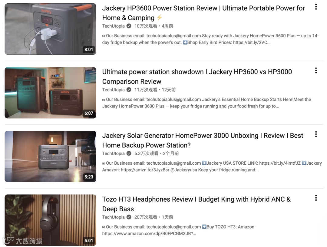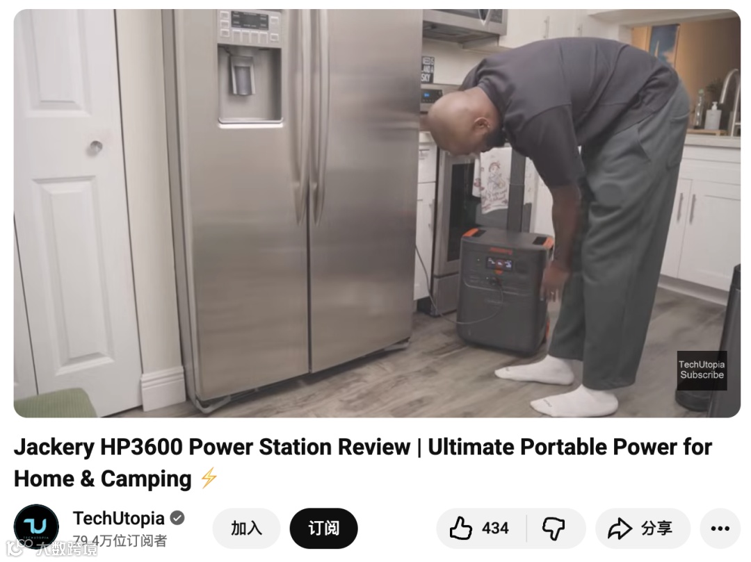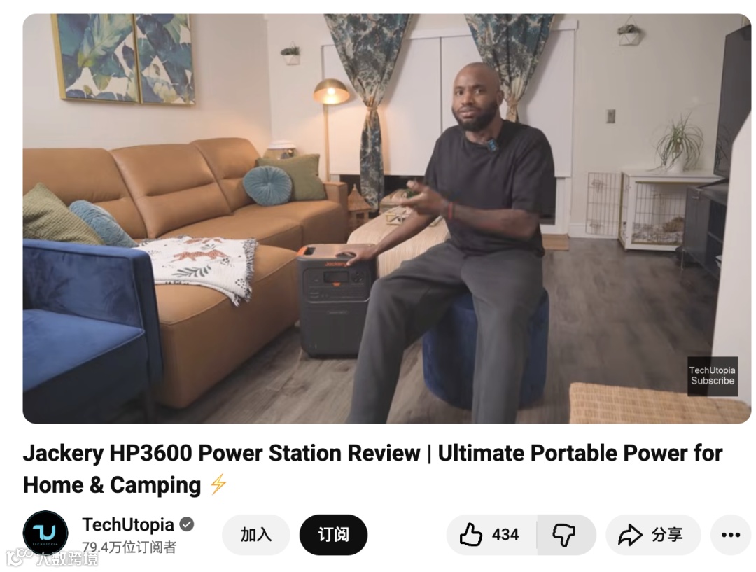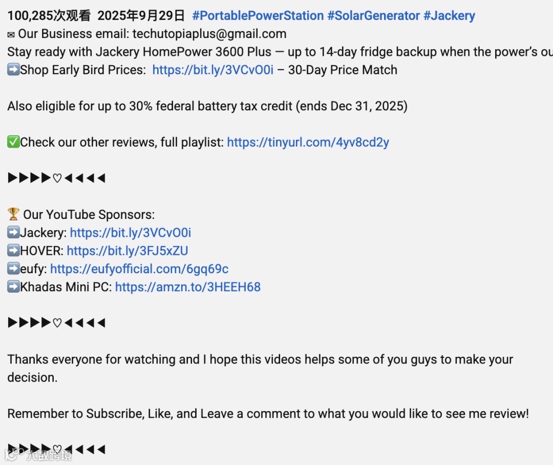 对 Jackery 而言,这种合作的意义远超一次推广。TechUtopia 的内容不仅带来了十万级精准曝光,更通过真实测评与导购链路(购买链接与赞助声明)实现了从流量到转化的完整闭环。更重要的是,这类视频在 YouTube 的搜索体系中具有长期效应,未来用户在搜索“Jackery 电站”或“HP3600 评测”时仍会不断被推荐到该内容,实现品牌的长尾曝光。