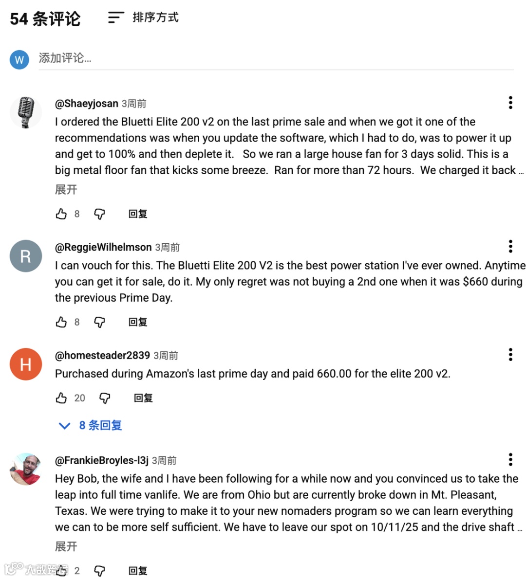 数据上看,这支视频表现不俗,仅一个月的播放量就达到 1.6万次,点赞 903 次,共有 54 条评论。更有价值的是评论内容:观众不仅讨论产品,还留言分享自己购买体验,如“我在上次 Prime Day 买了 Bluetti Elite 200 V2,运行了 72 小时无故障”,并收获数十个点赞。这些自然生成的口碑评论,成为视频长期的信任背书。