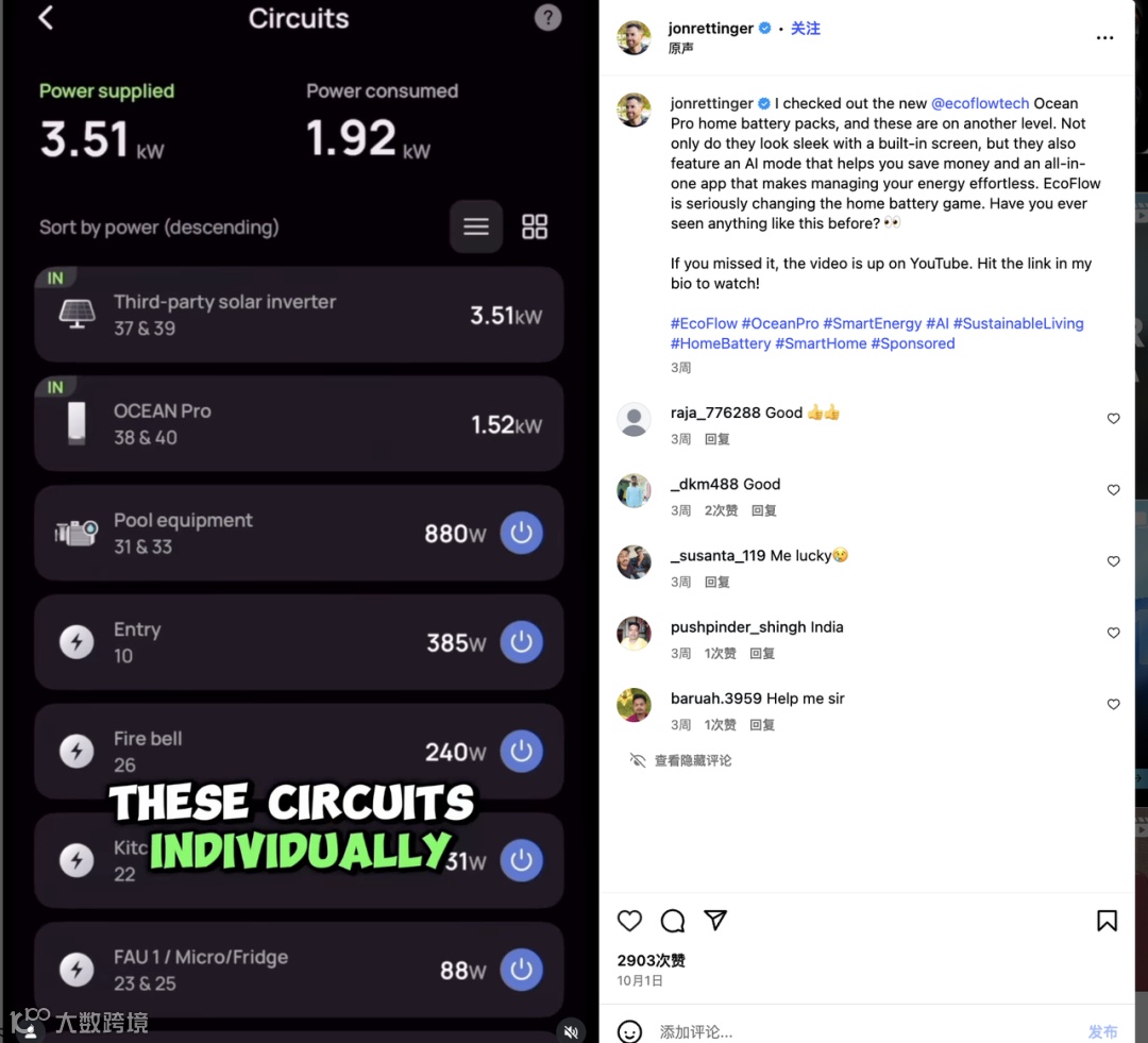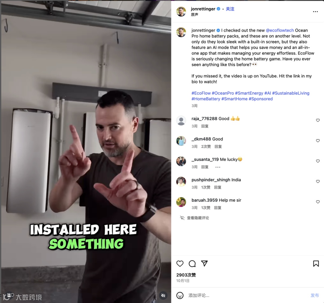 在他与 EcoFlow 的合作视频中,这种契合表现得尤为明显。视频以竖屏短片(Reel)的形式呈现,Jon 亲自出镜,在自家车库环境中介绍 EcoFlow 的家用储能系统。镜头捕捉到了设备的外观、接口和屏幕操作,他边演示边讲解:“这款设备内置 AI 节能模式和 APP 控制,让能源管理更轻松。”这种实地展示远比单纯的广告语更有说服力。视频中字幕清晰、节奏紧凑、信息量集中——非常符合短视频受众的观看习惯。帖子还带有 #Sponsored 与 #EcoFlow 标签,表明这是官方合作内容,同时保持了透明与合规性。