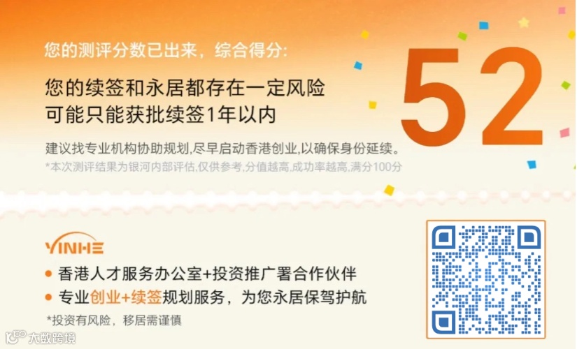想提前了解自己的香港身份续签成功率及年限?只需30秒,扫码下方二维码,完成简单测评,即刻获取结果↓↓↓得分越高,续签成功率越大,助您轻松掌握续签前景↓↓↓或者加VX【18124517435】一对一咨询