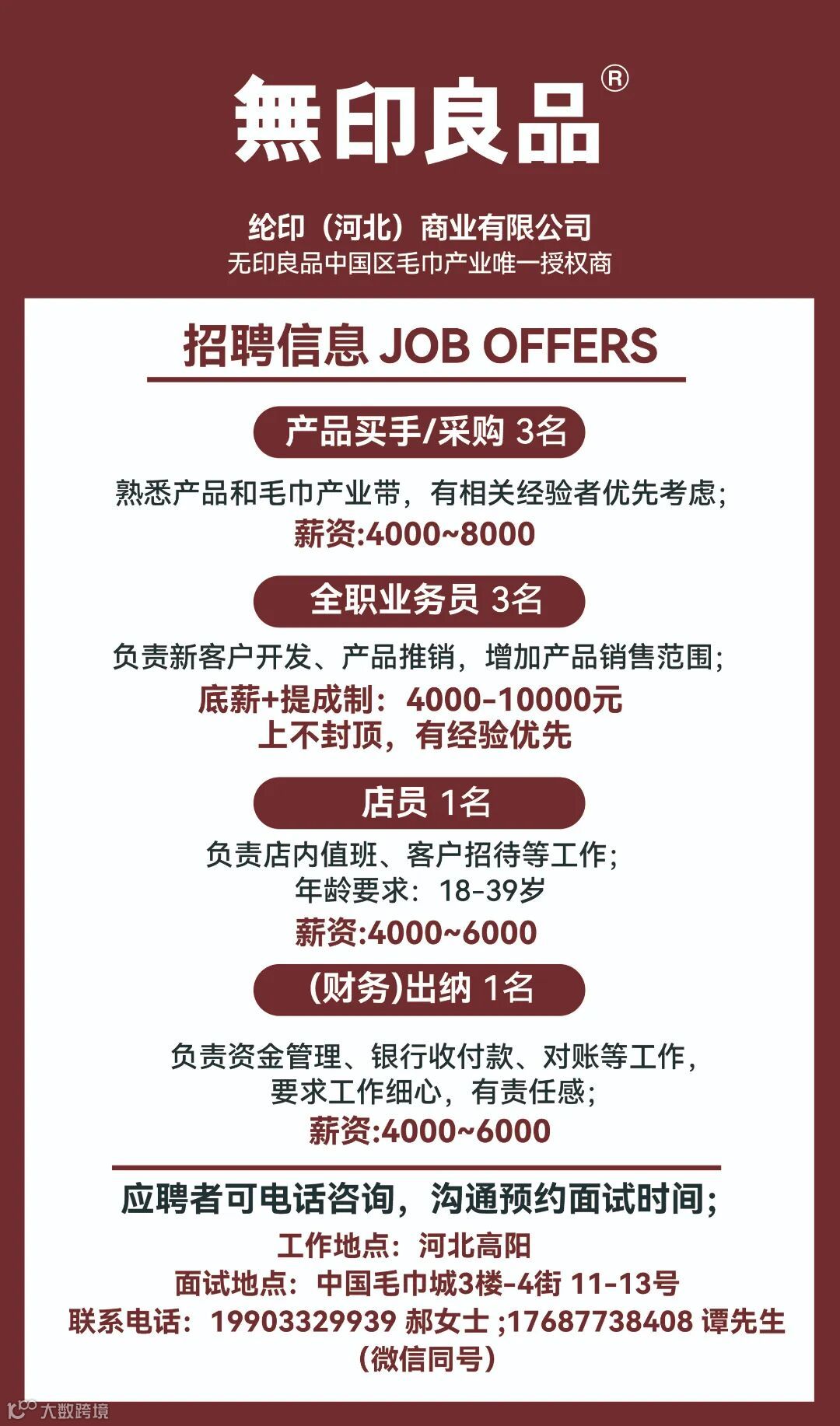 【无印良品】 纶印(河北)商业有限公司 急聘 产品采购/买手3名(4K-8K),熟悉毛巾家纺等有经验者优先;全职业务员3名(底薪+提成,4K-10K上不封顶);店员1名(薪资 4k-6k),面试地点高阳中国毛巾城3楼4街11-13号。电话:19903329939、17687738408