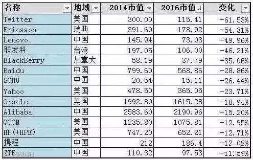 Twitter占据了快速滑落公司的榜首,年初Twitter的市值还是新浪微博的几倍,但年中一度被微博反超。