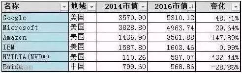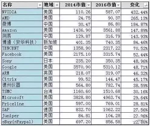 又是清一色的美国公司,百度勉强挤在里面。英伟达的市值2年增加了5倍,可以想象现在的人工智能有多火。