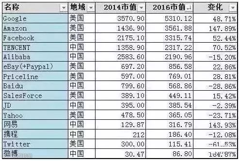 TOP互联网公司里面,美国8家、中国7家,中美两国统治整个互联网产业。