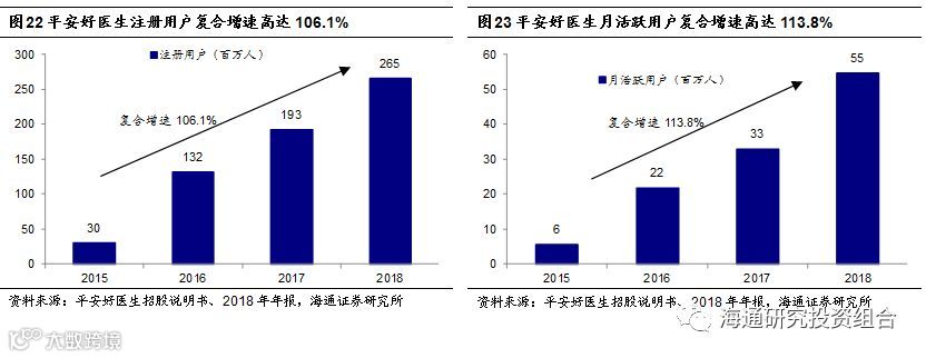 平安好医生以移动问诊核心流量入口,用户量增长迅猛。根据比达咨询数据,各类移动医疗应用日活跃用户中移动问诊类占比高达41.5%。平安好医生基于移动问诊业务优势,重点增加用户,用户增长迅猛,平安好医生注册用户从2015年的0.303亿户增长至2018年的2.65亿户,年复合增速高达106.1%,平安好医生月活跃用户从2015年560万户增长至2018年5470万户,复合增速高达113.8%。公司发展早期核心在于获取用户,这一时期公司比较合适用EV/MAU、EV/DAU来估值。