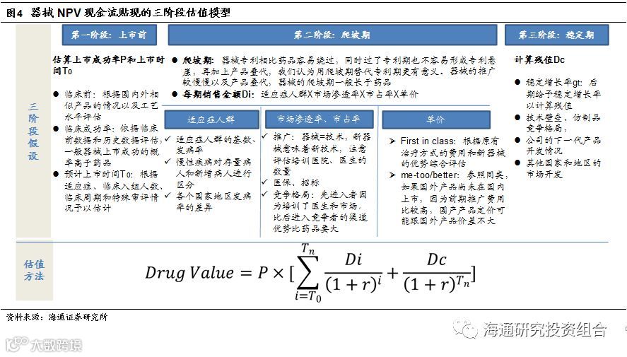 我们认为当前通行的创新器械估值还是NPV现金流折现,基于风险调整现金流折现估值法。与创新药相比,我们认为创新器械的估值有三大不同: