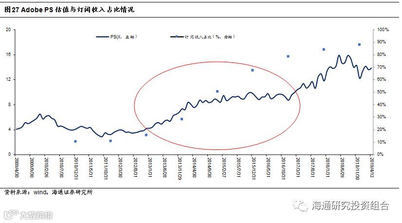 3)转型后:宜于采用PS估值体系。在转型云服务公司之后,公司净利润持续高增长,适宜于采用PS估值体系。SaaS软件订阅模式下云服务下的收入稳定性和可预测性大大提升,风险降低;同时公司的净利润率和ROE较转型前均有了显著提升。公司的PS估值中枢较转型前和转型中显著上移。