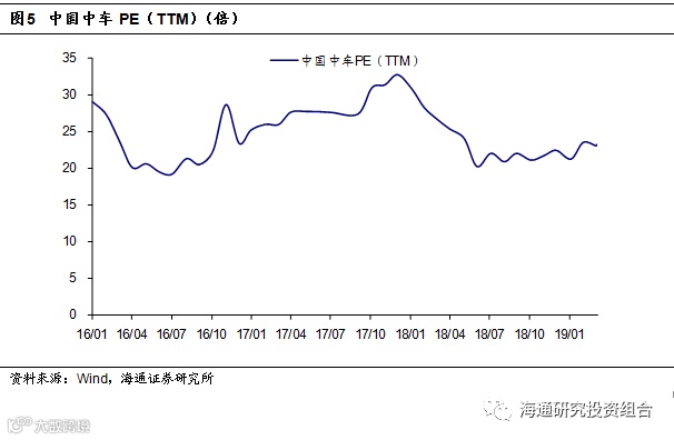 案例分析:中国中车。中国中车是全球规模最大、品种最全、技术领先的轨道交通装备供应商。2018年公司铁路装备和城轨与城市基础设施收入达1553.32亿元,占收入比例达70.90%。从公司铁路装备收入与铁路固定资产投资、公司城轨收入与城轨投资看,具有较大关联,且近年来处于稳定发展阶段,因此从铁路装备龙头公司角度看,在平稳发展期先进轨交装备公司适用PE估值法。