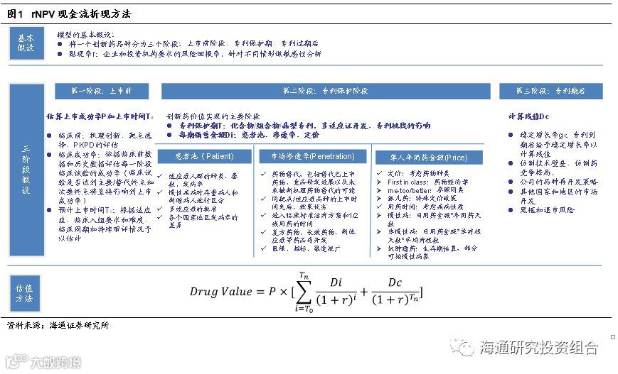 创新药产品线估值的“金标准”——rNPV(基于风险调整的现金流折现法)。相比于一般绝对估值方法,rNPV将技术性风险从折现率中独立出来,更加适合高风险的创新药产品线估值。该方法把一个创新药品种分为上市前、专利保护期、专利过期后3个阶段,药品上市成功率P可根据可比项目的临床前、临床阶段成功率进行估算,贴现率r则需要针对不同情形做敏感性分析。
