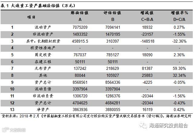 案例分析:中国重工发行股份收购资产。中国重工是我国大型海工及船舰制造企业。2018年2月,公司公告拟通过发行股份的方式收购少数股东持有的大连重工、武船重工股权。根据2018年2月公布的《中国船舶重工股份有限公司发行股份购买资产暨关联交易报告书(修订稿)》,中国重工对大连重工和武船重工的收购都是通过基础法进行定价评估。通过资产基础法,大连重工的资产价值为388亿元,增值率为0.42%,以下为该方案定价过程。