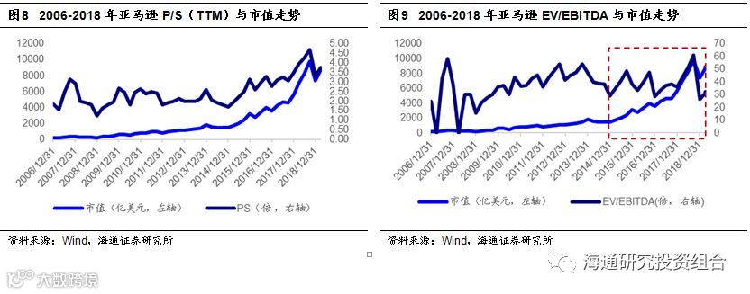 对于类似亚马逊的分阶段成长的重资产型公司,不同阶段应选用不同估值方法。在快速扩张发展期,即亚马逊零售业务初期至成长期(1995-2005年)和云计算业务初期至成长期前期(2006-2014年),受研发及营销费用较多、AWS采用“超低价+巨量+微薄利润”营销原则、大量并购影响,公司负债折旧高,现金流和净利润较少,常使用P/S估值法。对比亚马逊P/S(TTM)与市值走势情况,2014-2019年P/S在1.6-4.7x区间内波动,与市值实现同涨同跌。在云计算成长中后期(2014年后)&零售产业稳定成熟期(2015年后),前期并购带来的折旧摊销和商誉使得EBITDA率[1]上升,适用EV/EBITDA估值法。2013-2019年,EV/EBITDA保持在31-61x的区间范围内波动,与市值联动效果较为显著。而完全成熟的亚马逊公司业务种类较多,不同种类业务行业情况有所差异,如果按同一估值尺度来衡量会有偏差,因此根据稳定的业绩或者不同种类的业务拆分使用P/E、SOTP(分部)估值更加合理。