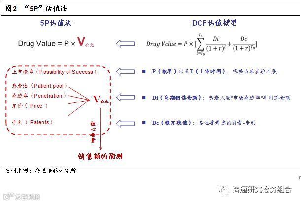考虑到绝对估法值引入太多的参数且不够直观,不适用于二级市场,我们采用“5P”估值法进行创新药估值。“5P”即上市概率(Possibility of Success)、患者池(Patientpool)、渗透率(Penetration)、定价(Price)和专利(Patents& exclusivity)。其中,上市概率反映药品成功上市的可能性,患者池、渗透率、定价反映产品市场空间,专利反映了产品的生命周期。这5个因素对创新药公司的未来现金流影响重大。