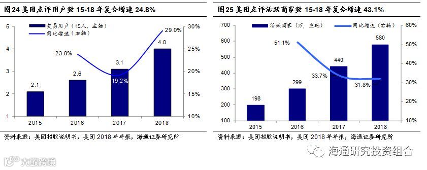 美团进入成长期,用户数由高速增长转入中速增长。美团点评前身美团网成立于2010年,美团点评目前处于成长期,交易用户数由2015年2.1亿增长至2018年的4亿,年复合增速24.8%,活跃商家数由2015年的198万家增长至2018年的580万家,年化复合增速43.1%,用户增长由高速增长转入中速增长。
