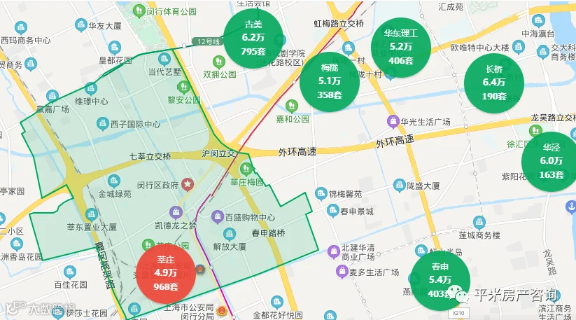 莘庄是古美南侧,春申左侧的外环外区域,也是1号线终点站与5号线起点站的交汇处,来往人流密集,商业发达,医疗资源尚可,有闵行区中心医院。莘庄的教育资源也是非常不错的,公办小学有闵行实验小学莘松校区、莘庄镇小学,公办初中有莘松中学莘松校区。九年一贯制公办学校有上师大康城实验学校、莘城学校和莘光学校,升学数据尚可。莘庄的北部与中部以成片的老公房为主,单价低,在4万左右,一房总价200万,两房总价300万左右。闵实验学区的老公房单价要高许多,达到6-7万,两室在350-400万之间。莘庄商圈周围有一批2000-2005之间建造的老商品房,有些品质还是不错的,如好世鹿鸣苑是电视剧《欢乐颂》的拍摄地。此区域由于交通方便、商业设施齐全,单价达到6-7万,两房总价500-600万,三房总价700-900万左右。讲到莘庄板块的住宅,还有一个绕不开的话题就是西侧的上海康城,是上海最大的小区,户数达到12000户,庞大的抛盘导致价格居低不上,单价在3.5万左右,两房总价350-400万,三房总价450-500万左右。