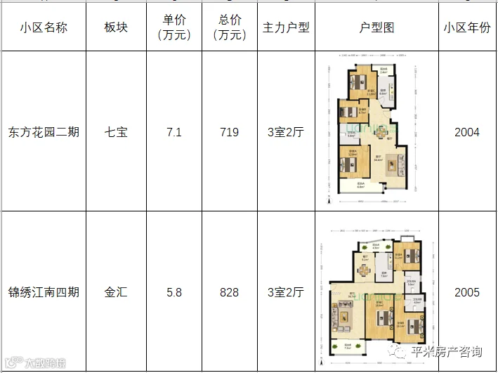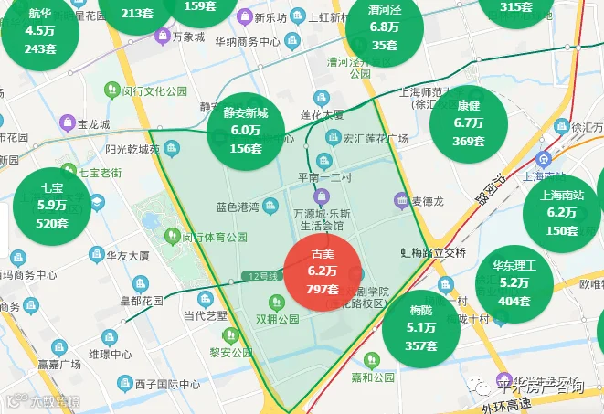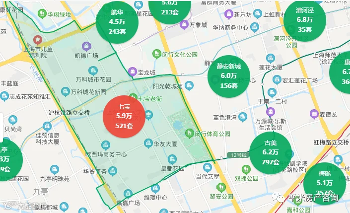 第二梯队:学区房或优质地段商品房。单价6-7万,两房总价500-600万,三房总价700-800万左右。这一级的房源是买学区房的家长最关注的,分布在七宝、春申、古美、莘庄、紫竹等优质公办学区。这个总价段的房源还有一部分是在金汇和华漕,虽然地理位置更好,但由于没有优质学区,单价和总价与其他区域学区房相仿。
