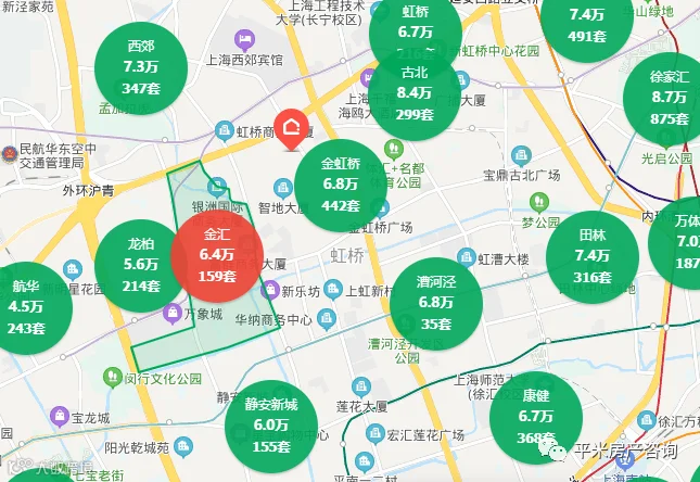 毫无疑问,金虹桥是闵行区地段最好的板块,北侧的长宁西郊、古北都是富豪区域,东侧接近内环线,能共享到徐汇区第六人民医院之类的优秀配套。闵行区唯一的中环内区域就在金虹桥,基本与长宁古北融为一体,新建住宅基本都是豪宅定位,次新房如翡翠名都、古北大成公馆单价达到10万,三房总价在1500万以上,古北壹号贴着虹桥高尔夫球场而建,品质顶尖,是全上海排得上号的顶级豪宅,总价5000万以上。金虹桥板块由于缺乏公办优质学区,普通商品房的单价与七宝、春申差别不大,在6-7万左右,户型偏大,两房总价在600-700万,三房总价在800-1000万之间。还有不少品质优秀但户型怪、年份久的外销房如名都城、华光花园,三房总价在900万以下。中环线以西有一块是别墅区,虹桥高尔夫别墅总价在1500-2000万左右,是高性价比的市区独栋别墅。
