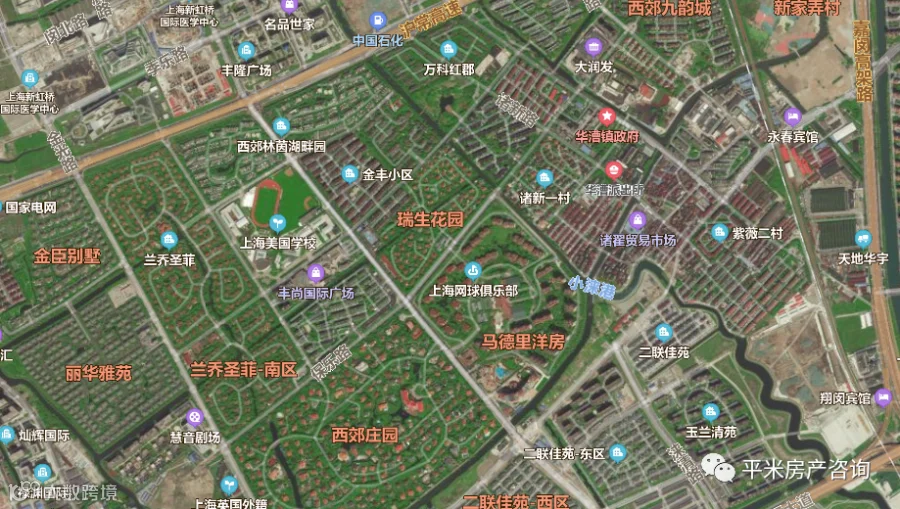 沪常高速以南,嘉闵高架以西是一个老牌的别墅区,绿化率高,住宅密度很低。