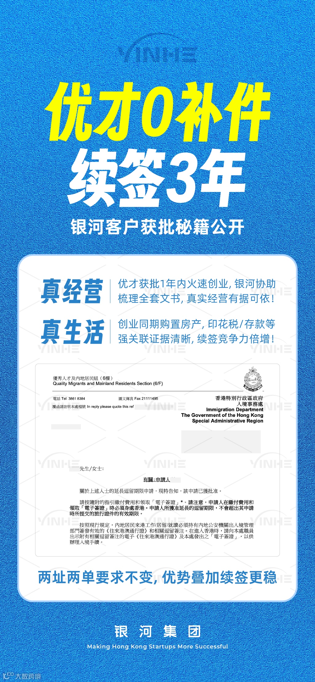 客户优才获批1年内就火速创业,在港公司业务真实经营,并在香港购置方案作为居住地址证明。银河续签服务团队110个服务节点动态跟进,协助梳理全套文书,让其香港公司真实经营有据可依,并且客户在港购置的房产,印花税/存款等强关联证据清晰,续签竞争力倍增,一次顺利续签3年。