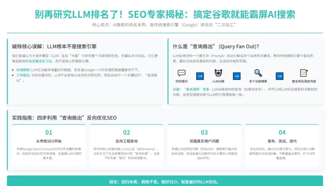 1. 停止幻想:不要再相信有什么神秘的“LLM优化”技术。LLM本身不负责排名,它只是一个信息整合工具。