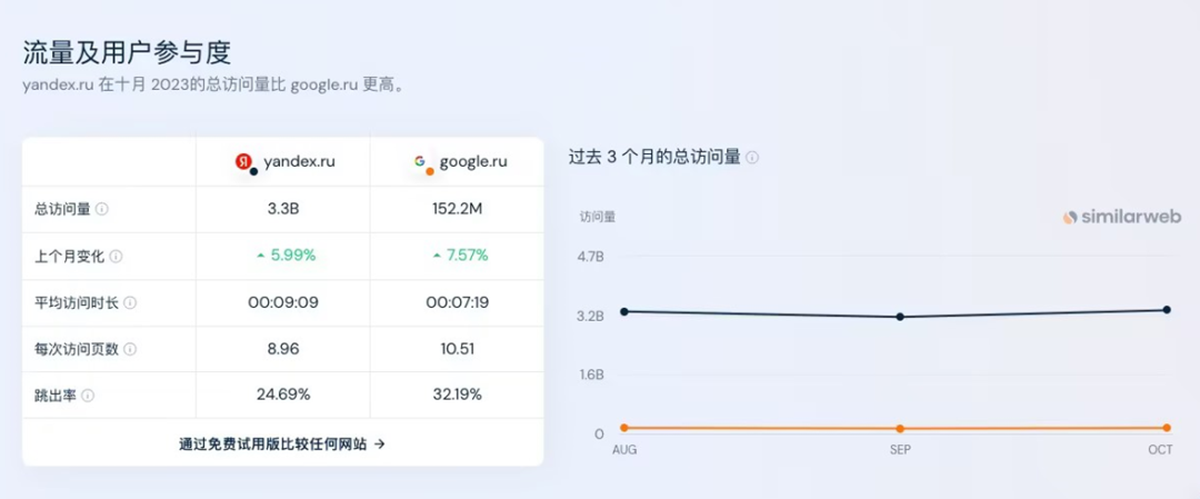 yandexru在十月2023的总访问量比 google.ru 更高,是俄语网站访问最高的搜索引擎。