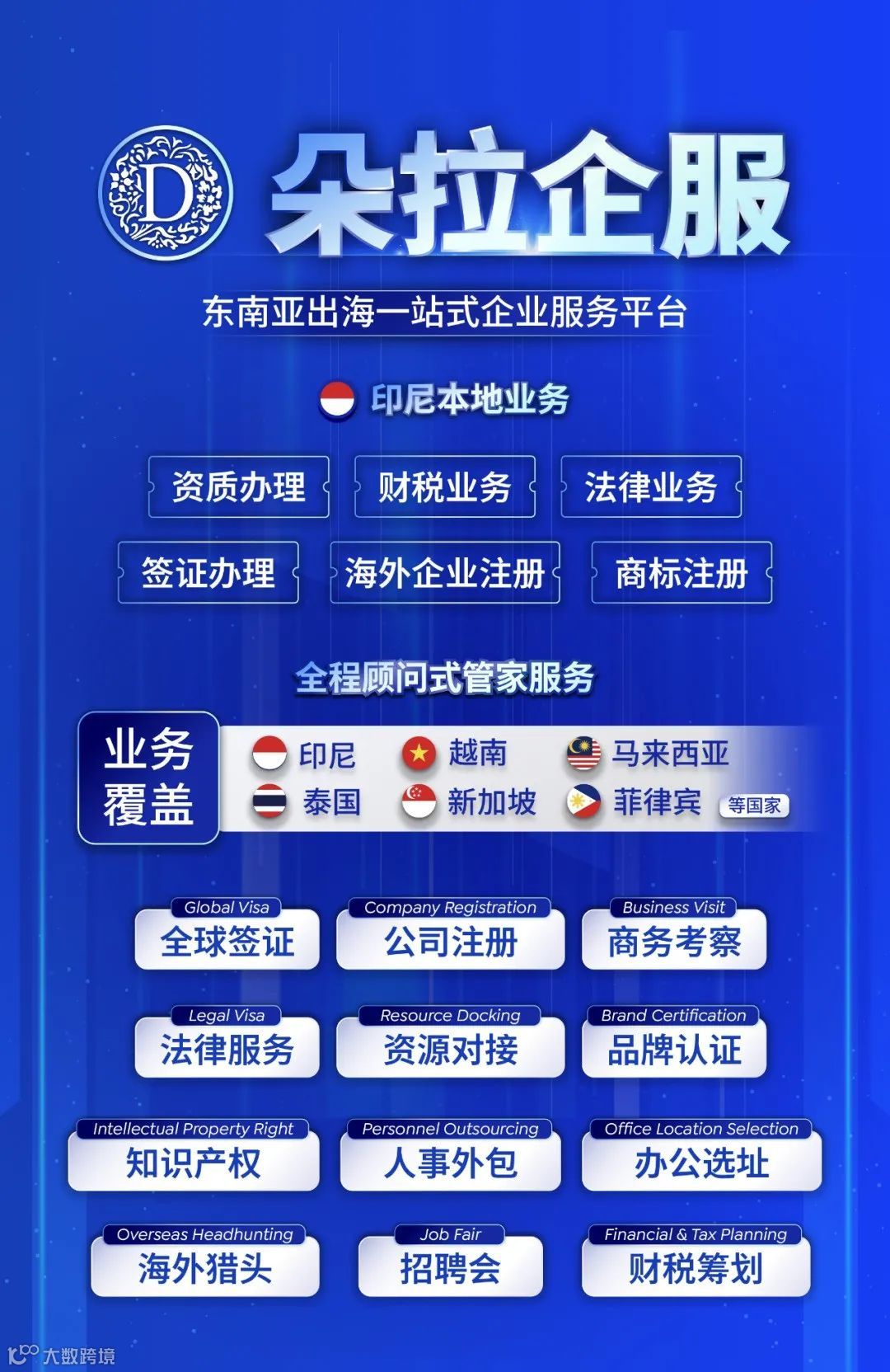 上海朵啦商务服务有限公司(简称朵拉企服)自2019年成立以来,作为国内人力资源专业领域出身的服务供应商,我们已经带领众多中国品牌企业开拓海外市场,落地东南亚。公司力争立足印度尼西亚,辐射东南亚,推动科技赋能,提升企业管理品质。相继在中国上海和印尼首都雅加达开设了公司,搭建中、印、英语等高端人才的本地化服务团队,为出海企业提供全程顾问式管家服务,以成为东南亚出海企业首选一站式服务平台。