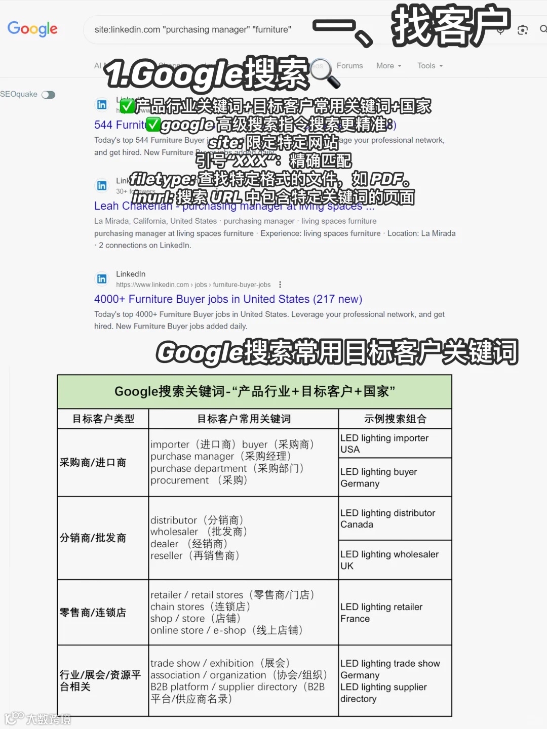 Google搜索:产品/行业词+国家+客户身份词如supplier