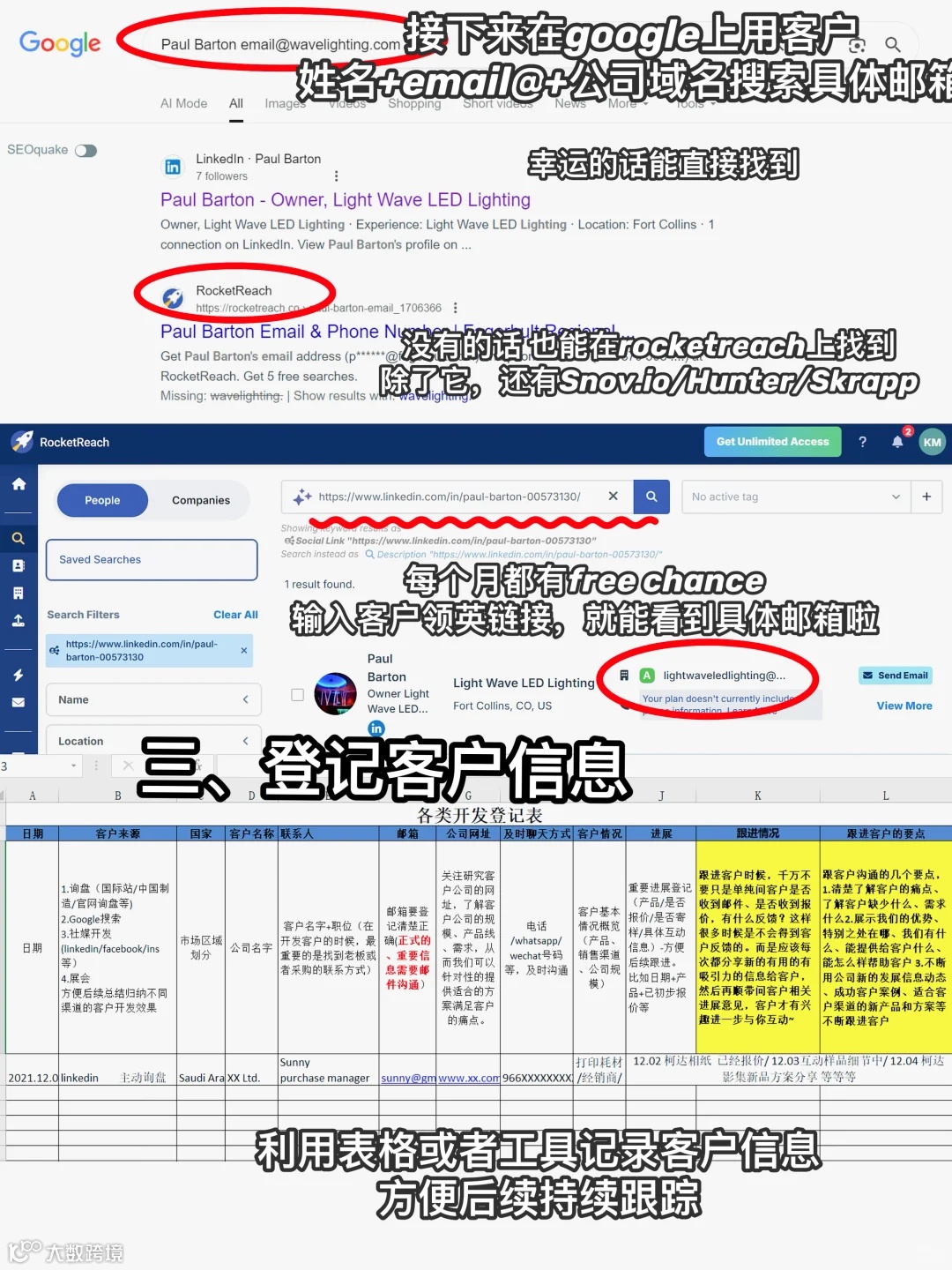 领英+Google搜索,在领英找公司关键人(老板/采购/销售负责人),再用google搜索(人名+email+@客户公司域名),很可能找到客户邮箱