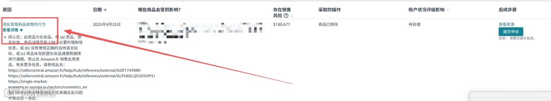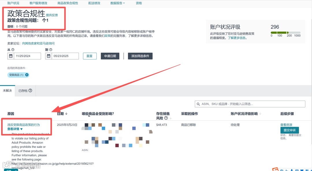 (若是禁售商品的话,申诉的成功率极低,只能点击“承认违规”,根据要求移除库存和,删除asin,这样可以消除绩效,但是listing无法恢复)
