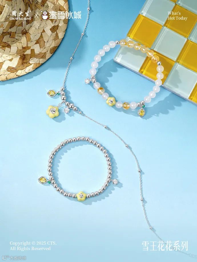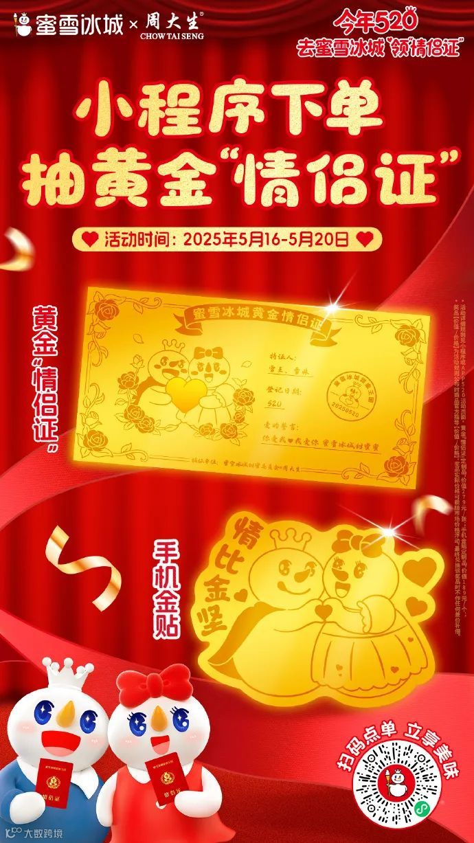 上市时间:5月20日周大生联手国民茶饮品牌蜜雪冰城,在520推出黄金“情侣证”及雪王主题串珠系列[k]。其中“情侣证”金钞限量2000张,标注持证人信息与登记日期,兼具纪念与收藏意义。蜜雪冰城线上点单可抽奖获得黄金礼品,强化品牌联动。产品定位轻量化、低价位,主打年轻情侣无压力消费,网友戏称“蜜雪冰城要把黄金价格打下来”,为珠宝联名开辟亲民化新路径。