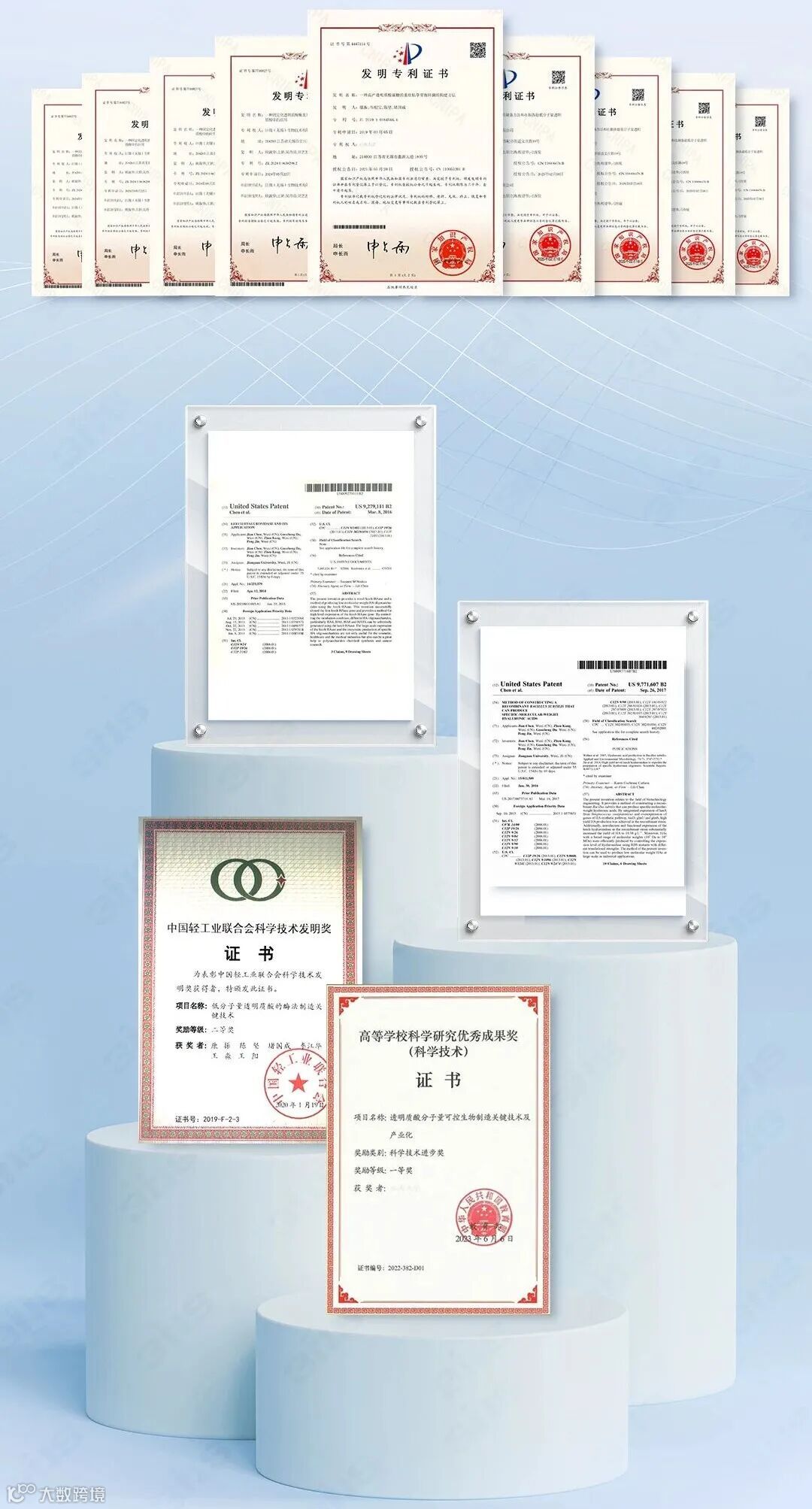 公司在科技创新方面成果显著,累计拥有国家发明专利超30+项,多项已实现产业化并取得良好市场效益。与上海应用技术大学等单位合作的项目,先后荣获中国轻工业联合会技术发明奖二等奖、教育部科技进步奖一等奖等荣誉。