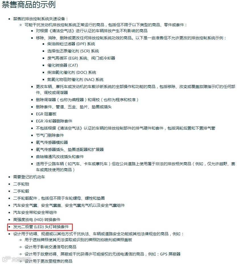 而本次通知中,亚马逊则是明确指出,发光二极管(LED)前照灯转换套件不符合联邦机动车辆安全标准。已被亚马逊美国站列为禁售商品。