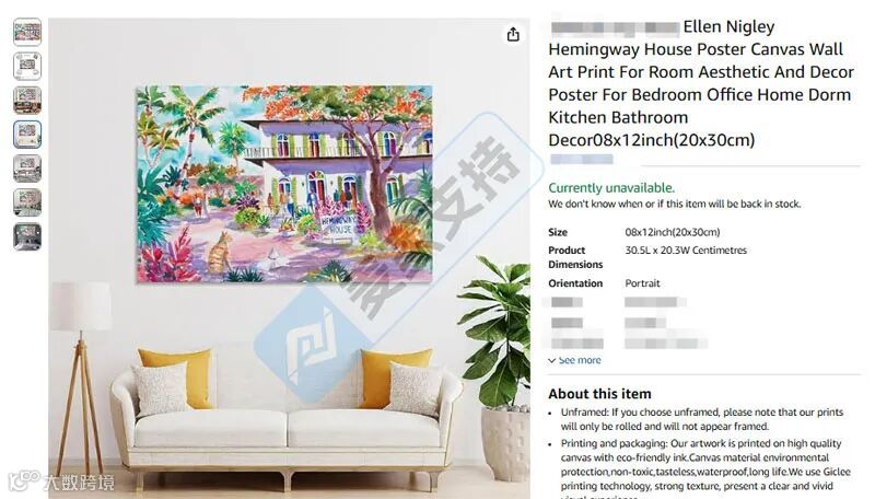本案是keith律所代理的一起全新版权维权案件,原告Ellen Lynn Negley针对其于2025年8月19日在美国注册的版权号为:VA 2-458-625、VA 2-458-621、VA 2-458-623、VA 2-458-624和VA 2-458-622等5个版权作品发起的维权,该系列作品均为热带风情系列水彩画,被广泛用于家居装饰、服饰以及餐具等多个类目,未经授权使用则会构成侵权风险,跨境卖家需尽快排查并下架高危产品!