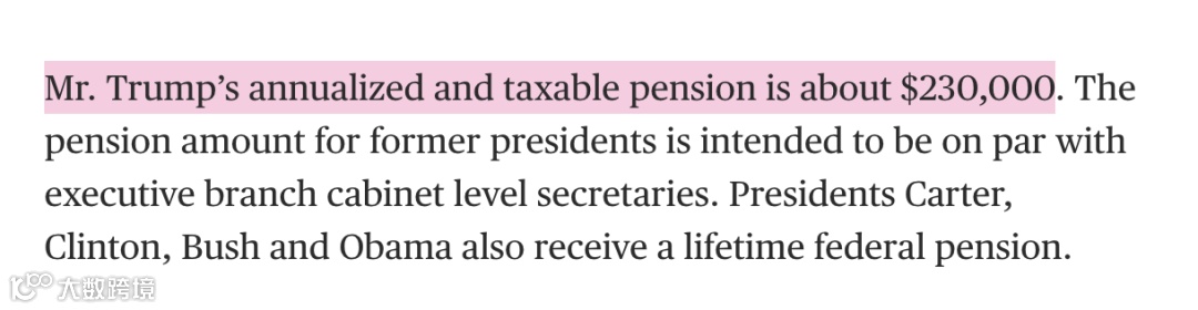 卸任后,前总统依据1958年《前总统法案》可领取与内阁部长相当的退休金,目前金额为每年23万美元[k],并享有医疗、办公场所、员工经费及公务旅行津贴等持续支持[k]。此外,回忆录出版、公开演讲及媒体合作成为前总统重要收入来源,其中回忆录收入常达数百万美元[k]。