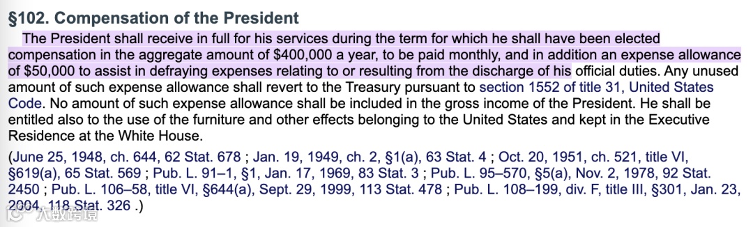 根据美国法典第3章规定,总统年薪为40万美元,按月发放[k]。此外,还包括多项补贴与福利:5万美元免税费用、10万美元旅行补贴、1.9万美元娱乐补贴、10万美元白宫入住装修补贴,以及免费医疗和总统专车、海军直升机、空军一号等交通工具[k]。综合计算,总统实际年度待遇总额不低于56.9万美元[k]。