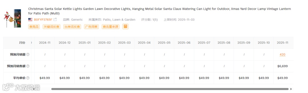 表格证实了该产品在 2025年11月之前并未销售。8月、9月、10月的数据均为“/”(无数据),但价格已预设为 $49.99。这表明卖家可能在为年末的节日旺季做准备和预热。