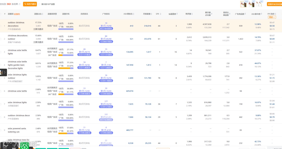 多数流量词的流量类型为视频广告词,且部分词广告流量占比达 100%(如 “outdoor christmas decorations”“christmas decorations outdoor”“solar christmas lights outdoor” 等);少数词结合自然搜索词和视频 / SP 广告词(如 “christmas solar kettle lights” 系列词,自然搜索词占比在 27.17%-77.33% 之间,广告流量占比相应为 72.83%-22.67%)。