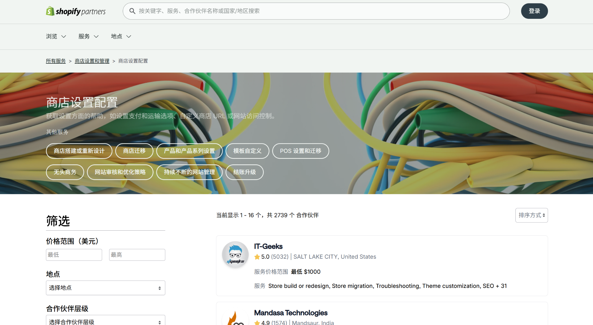 如果你清楚自己在寻找什么,可以使用合作伙伴目录找到专门从事这些领域的专家。在Shopify合作伙伴目录中按类别划分,帮助你快速识别专门从事你所需工作类型的专家。