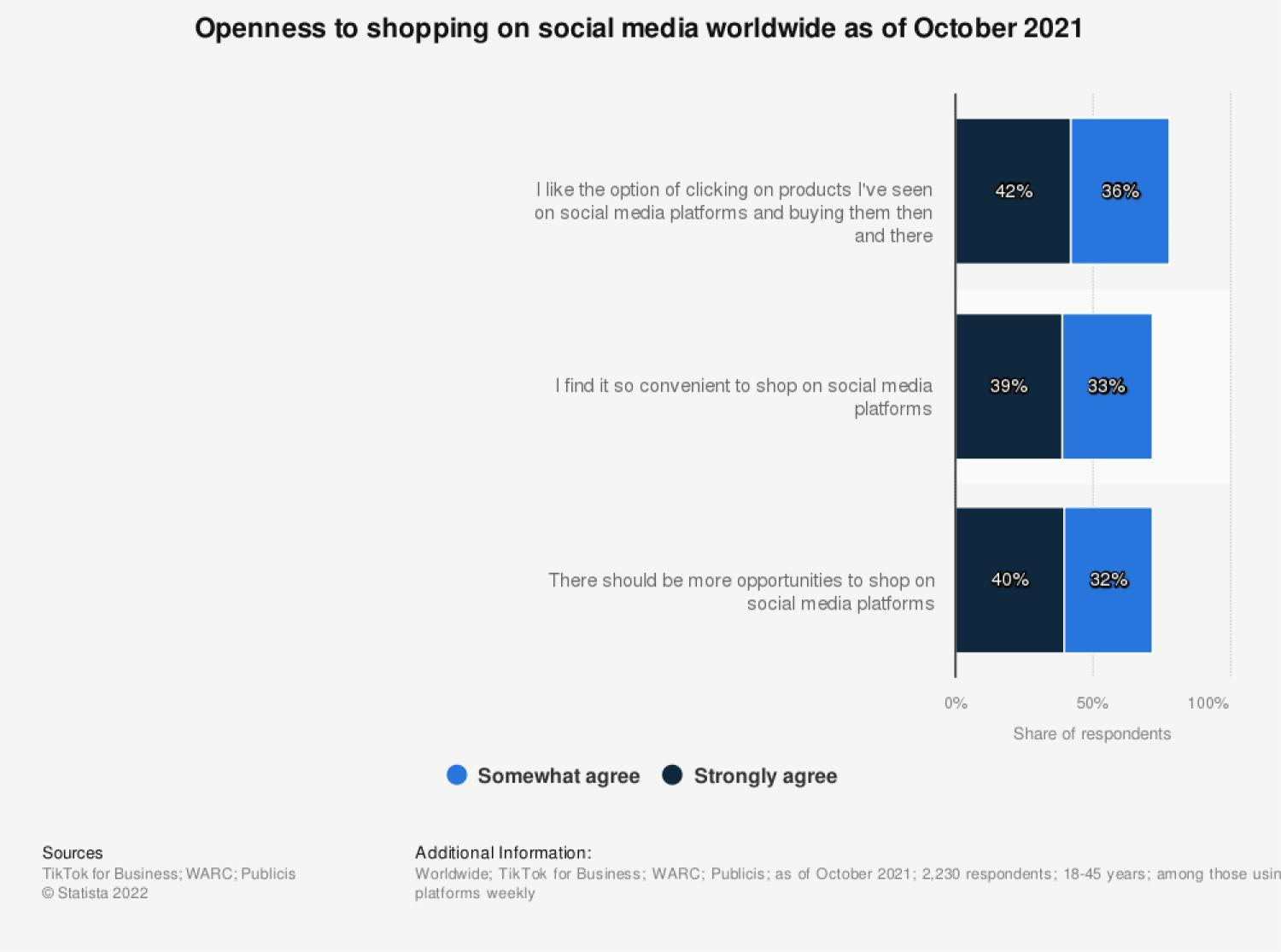 - 消除购买前的摩擦。78%的社交媒体用户表示,他们喜欢点击在社交媒体上看到的产品,并立即购买的选项。社交媒体商店利用这一点,使消费者能够在不离开应用的情况下,查看、浏览和购买产品。