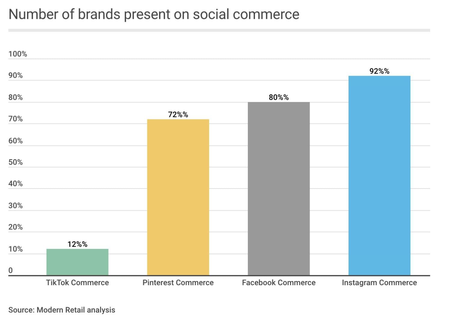 Instagram曾经是供用户与朋友分享照片的平台,而在将社交媒体网络转变为购物渠道方面,Instagram走在了前列。商店、直播和网红合作等功能的引入,使得绝大多数(92%)的在线零售商将该平台作为其社交商务战略的一部分,超过了Facebook、Pinterest和TikTok。