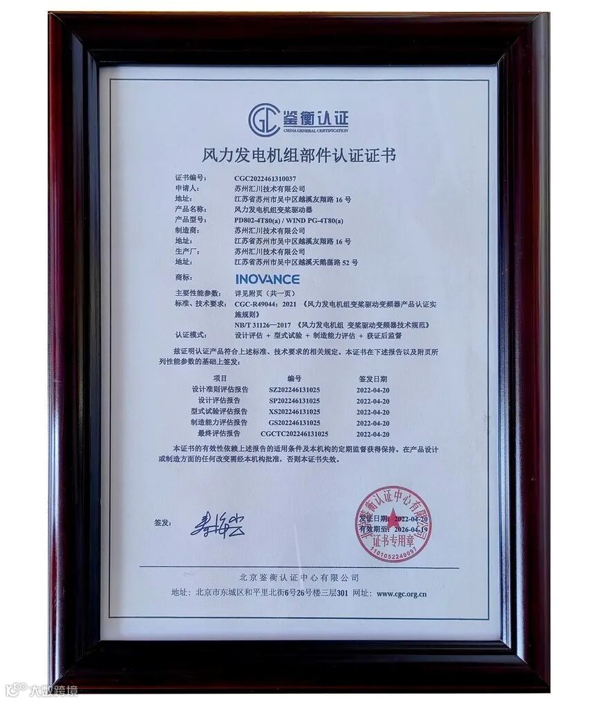 2022年12月,汇川技术自主研发的风电大功率变桨驱动器通过北京鉴衡认证中心认证,并获得该认证中心颁发的“风力发电机组部件认证证书”,这是我国首个为风电大功率变桨驱动器颁发的鉴衡认证证书。