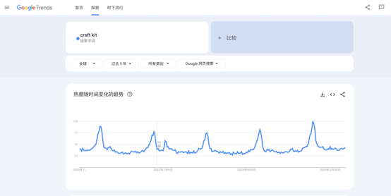 虽然手工套装并不是什么新鲜事,但这些产品在网上的关注度一直都比较稳定。如果你查看谷歌趋势就会会发现,过去几年中,这个关键词的搜索查询始终保持一致,并在节假日临近时,热度会出现规律性的激增: