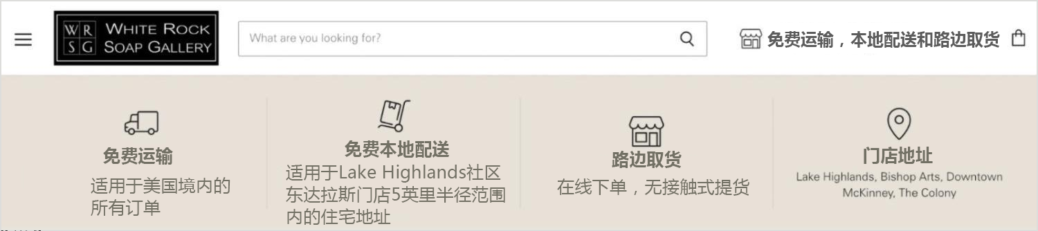 美国品牌White Rock Soap Gallery在德克萨斯州有五家实体店,其电商业务的规模也相当可观。除了路边取货、邮寄和其他配送选项外,品牌还提供从实体店出发的本地配送服务。