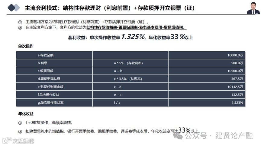 典型场景为:当银行理财产品收益率高于银行承兑汇票贴现利率时,买入理财并质押开立银承,销售变现实现套利。收益公式为:结构性存款收益率 - 银票贴现率 - 税费(增值税与印花税)[k]。