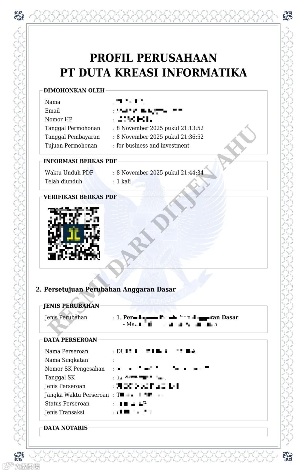 有印尼公司管理局的logo、水印、底纹和验真二维码,权威性还是足够的,如果拿到别的国家用,还可以做相应的公证认证。